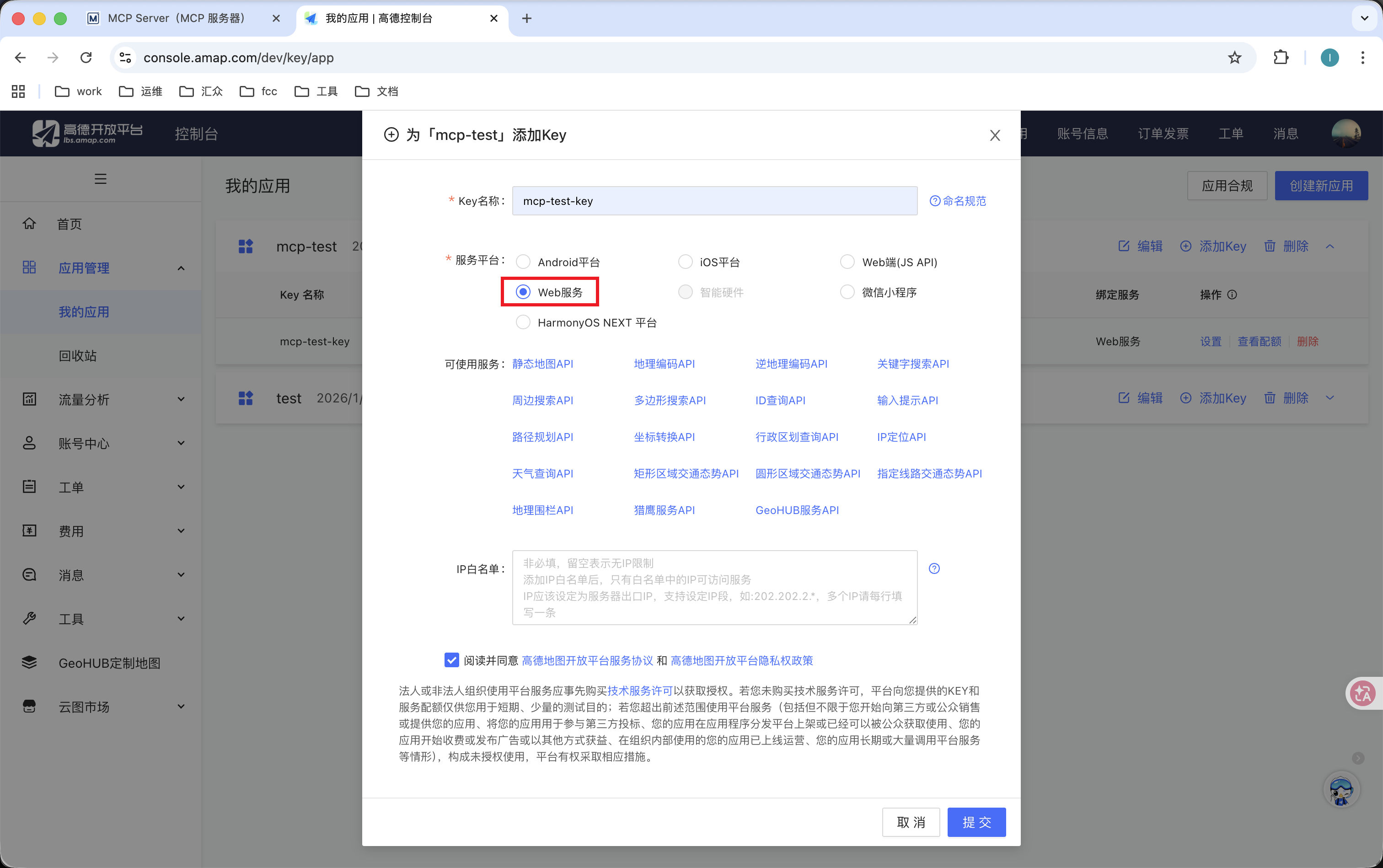 注意:服务平台选择Web服务,填写完成后提交,即可生成 API-Key,保存好该 Key,后续替换配置使用。
