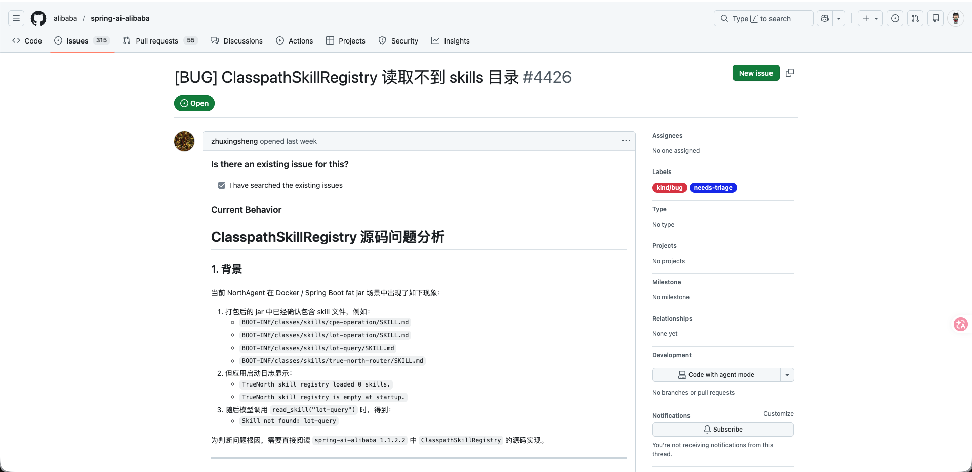 从 Issue 中得知,问题根源在于 SpringBoot 项目打包成 jar 包后,路径机制发生变化,导致 ClasspathSkillRegistry 无法正常加载 resources 下的 Skill 目录,这是目前 spring-ai-alibaba 框架的一个已知 bug。